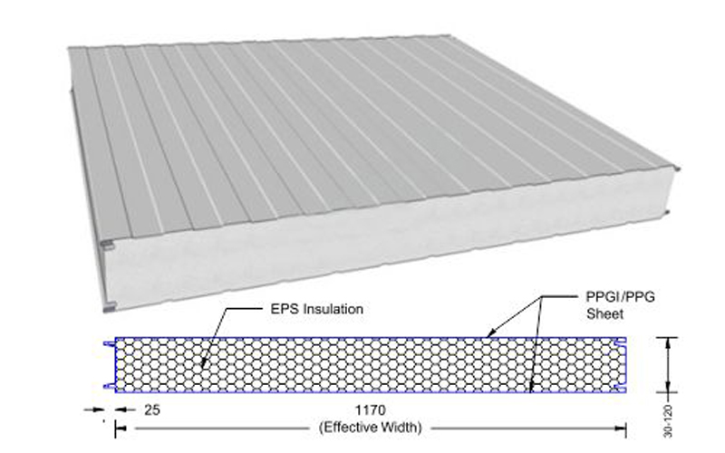 Polystyrene Sandwich Panel also called EPS Sandwich Panel. The top & bottom surface of this panel is Galvanized & pre-painted steelssheet, core material is Polystyrene, it is formed by laminating and pressing with 2 components PU glue.